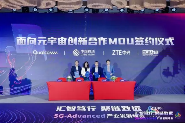 5G-Advanced为全行业勾画了广阔的技术蓝图,支撑丰富的新业务、新场景。本次峰会围绕被称为“元宇宙催化剂”的XR产业聚力,来自中国移动通信有限公司研究院、中兴通讯股份有限公司、高通无线通信技术(中国)有限公司和北京当红齐天国际文化科技发展集团有限公司签订《面向元宇宙创新合作MOU》,旨在推进产业链合作伙伴加强XR作为元宇宙入口的技术融合创新和端到端对接验证,促进无线网络与业务发展的高效适配,推动产业链稳进发展。