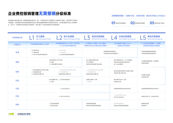 基于这样一套完整的重构连接财务新世界的实践,艾瑞咨询与合思·易快报在今年6月份联合发布了《中国费控管理平台场景洞察白皮书》,在这本白皮书中,围绕着财务报销全生命周期的申请、消费、报销、对账、记账、归档、报表七个过程,构建了企业费控报销管理的“无需报销分级标准”。