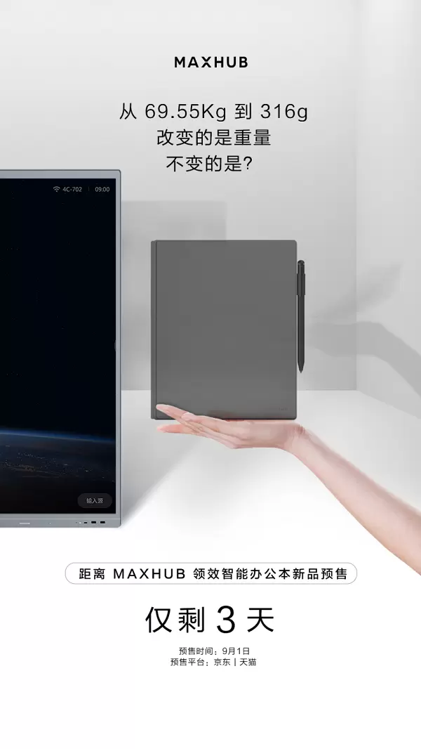 从官方发布的倒计时预热海报“从69.55KG到316g,改变的是重量,不变的是?”文案中,可见会议平板一哥对自身技术积累的自信。虽然更多新品相关信息有待揭晓,但相信凭借MAXHUB领效的技术积累和对办公效率场景的思考,一定会为我们带来更多价值体验和不一样的惊喜,让我们拭目以待。