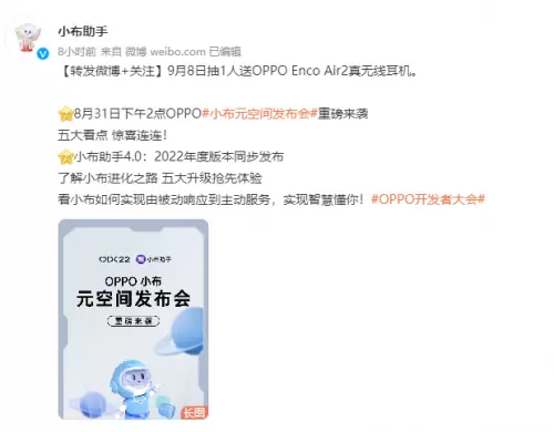 8月30-31日,OPPO ODC22即将拉开帷幕。作为大会的重头戏,OPPO小布助手在微博释出2022年度版本的升级内容五大看点,将在8月31日 14:00小布元空间发布会上逐一揭晓,精彩不容错过。