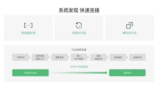 针对因为不同品牌、不同协议的终端设备造成的配网复杂、连接速度慢等问题,OPPO做到了系统发现,快速连接,实现极简快速稳定的发现以及连接配网。通过打通底层技术,实现了AP热点、局域网、蓝牙等多种设备协议的全面兼容,设备发现的准确率达到了92%以上,连接的速度低于 10秒,相较于行业传统的连接方式,速度要快一倍以上,极大的提升了用户的体验。