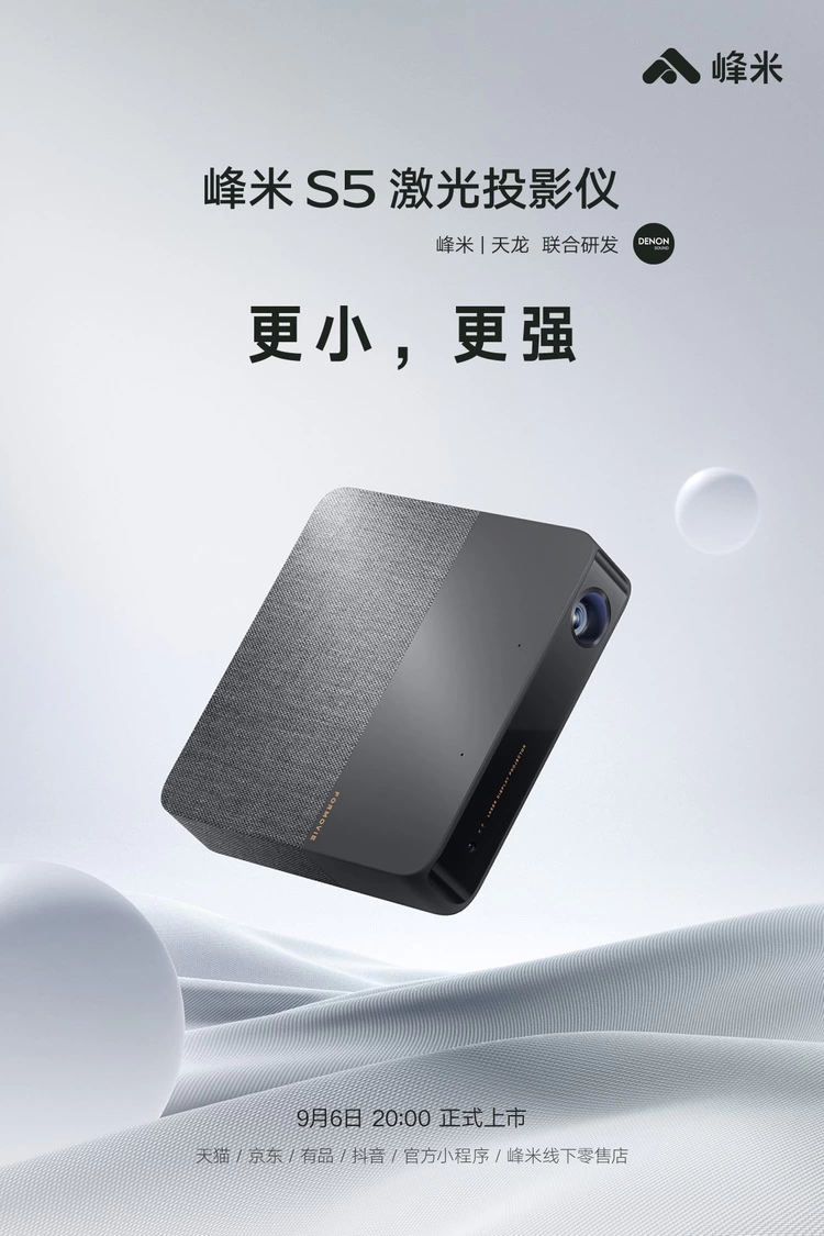 在9月,峰米S5即将问世,激光光源与小巧体积将为消费者带来怎样的全新使用场景?除此之外,峰米与DENON的合作还能为消费者带来怎样的震撼听觉体验?在硬件配置方面还有哪些创新突破?9月6日20点,峰米S5将在天猫、京东、小米有品、抖音等多家渠道开启预售,正如这款新品的口号“更小,更强”所言,峰米这次发布的新品是否能让消费者感受到小巧机身下隐藏的澎湃实力,我们拭目以待。
