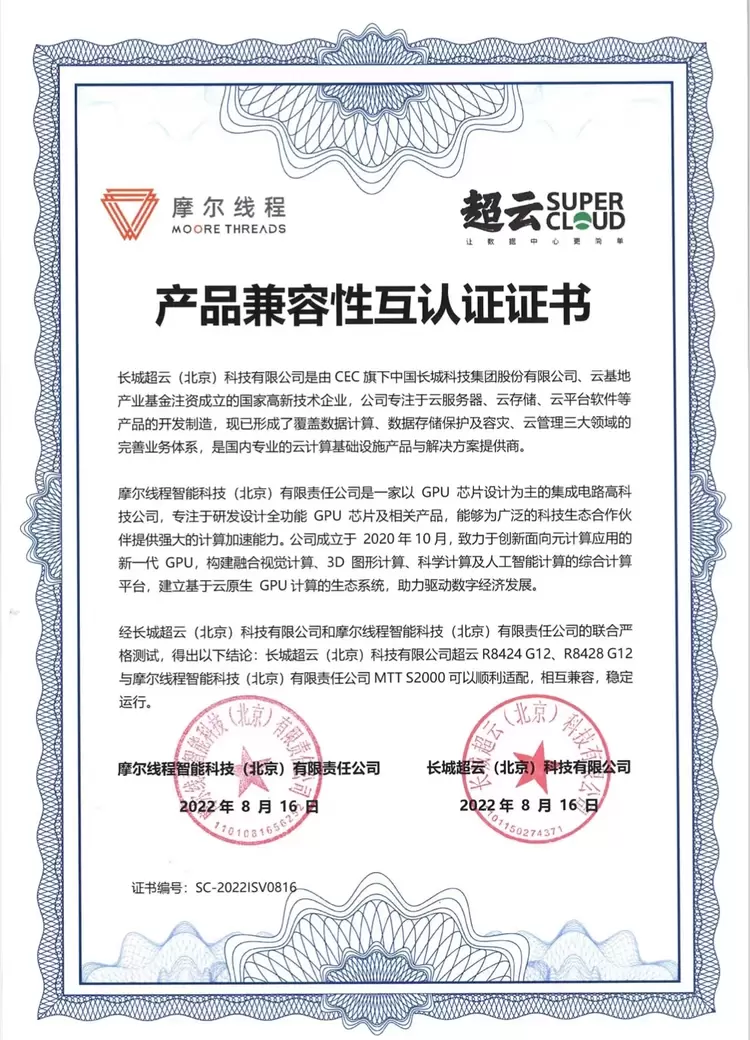 近期,长城超云服务器产品R8424 G12和R8428 G12与摩尔线程首款数据中心级全栈功能GPU MTT S2000完成产品兼容性互认证。