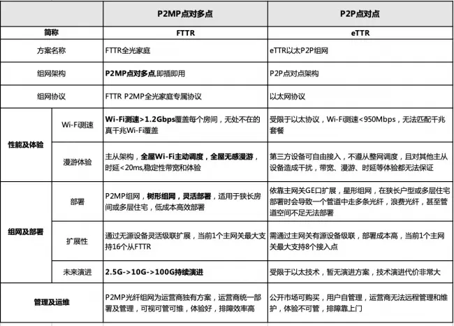基于P2MP点对多点的FTTR全光家庭方案为家庭宽带用户提供了极致的Wi-Fi体验。与此同时业界也存在基于P2P点对点架构组网方案的eTTR(以太P2P组网),也支持家庭内部组网,但相比P2MP点对多点架构的FTTR方案在组网架构、性能以及可扩展方面存在诸多不足。