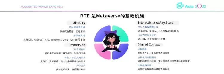 从用户体验的角度上,在虚拟空间需要像现实世界一样的沉浸感和随时随地,对应需要的是超低延时的网络传输以及空间音频,用户可以在元宇宙空间里面听到其他人从哪个角度走过来,声音会随着距离的远近有大小。