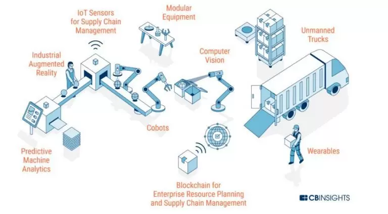 通过AI的预测与分析,生产线开始组织生产,工人佩戴工业AR检测品质,同时IOT传感器负责供应链管理,最后机器人装货、无人驾驶货车负责配送,工人也随身配有各种可穿戴设备。