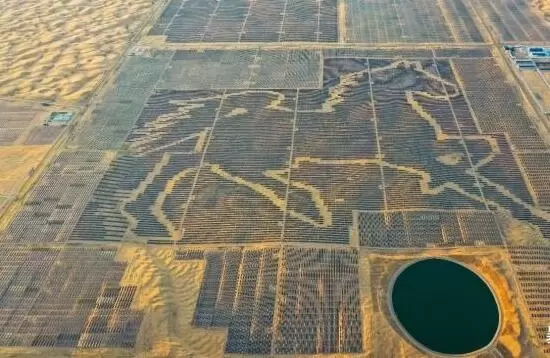 达拉特发电基地的环保成效也极为显著。基地投资2452万元在场区内设置网格立式沙障12000亩,按照支架类型在光伏板阵列之间分别种植经济作物矮枣树、紫穗槐和中草药黄芩等,并在种植区配套敷设滴灌系统。基地充分利用光伏板与周围低矮植被、黄沙之间的色差,在大地上描绘出了一张占地2097.6亩的“骏马图”。2019年7月基地通过吉尼斯世界纪录认证,成为世界上最大的光伏板图形电站,实现了经济效益、生态效益、社会效益多点共赢。