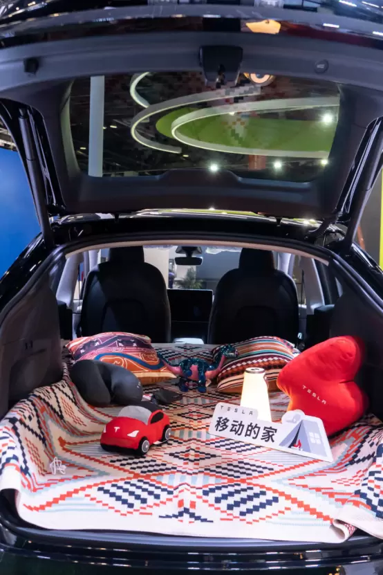 在“露营休闲区”,一辆特斯拉ModelY敞开后备箱、放倒后排座椅,铺上床具变身为舒适“卧房”,配合周围布置的特斯拉露营椅、唱片机、行李箱、保温水壶等周边,俨然一座闲适的露营地。在车内,体验者开启露营模式,保持车内空气流动、温度适宜,大屏篝火画面和音效营造浪漫氛围,想象躺在车内透过超大天窗仰望星空感受自然之美,或者忙里偷闲的在这里午睡小憩,逃离城市在车里露营放空。现场一位特斯拉车主表示:“以前开燃油车露营,睡在车里开空调怕一氧化碳中毒,不开空调又太热,现在换了特斯拉,完全没有这个担心了。”