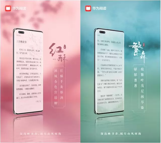 前不久,华为阅读全新上线的背景主题,其中包含5款诗意背景色:“既白”“黄栌”“红酥”“青苔”“月黑”和3款自然主题:“繁森”“沧海”“空镜”,每一种都由各自不同的图案、纹理、颜色组合而成,设计灵感来源于诗词,给阅读添点诗意。