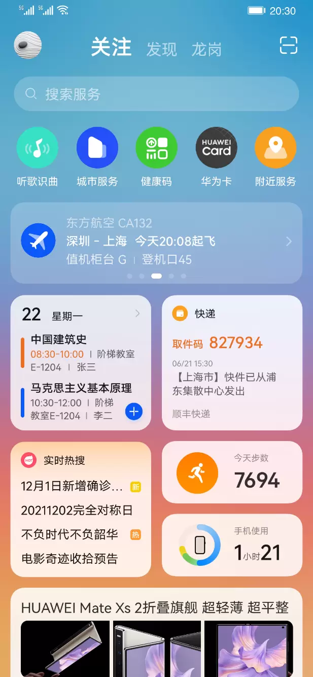 主屏右滑一下,打开华为智慧助手·今天,在日程卡片中导入课程表。日程卡片就可以将课程按照时间顺序展示,及时提醒,课程一目了然,帮助学生用户不遗漏重要课程。华为智慧助手·今天可以提醒快递信息、天气变化、电量预警等等,还可以一键打开健康码,让校园生活畅通无阻。