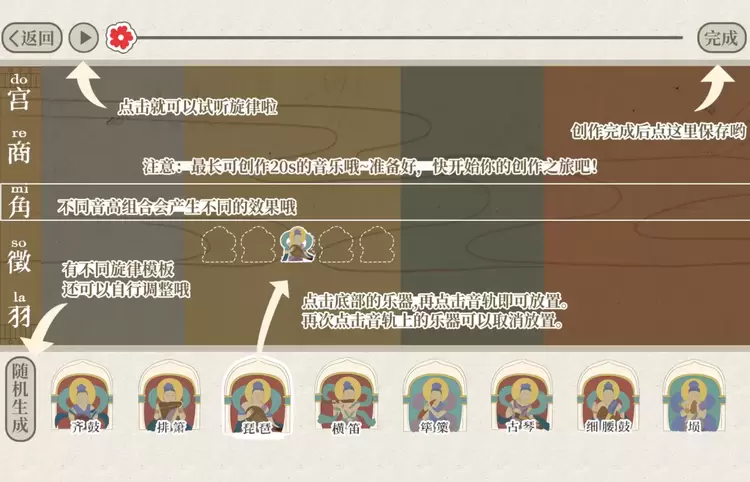云冈石窟第12窟以立体雕刻记载了古代音乐人的盛大演出场面,是研究中外音乐史最全面的实物资料,但却无音无谱流传。在编曲游戏中,玩家可以自由选取齐鼓、琵琶、排箫、横笛等不同的云冈乐器,通过有趣简单的操作,就能奏响“中国古代最早宫廷交响乐”;不仅如此,玩家通过分享自创旋律,还能获得并捐出“小红花”,助力“为1000位石窟寺守护人送出‘加油包’”公益梦想。游戏中所涉及的文字资料、石窟造像、手绘线稿,均由云冈研究院提供,其中的手绘线稿图,则由研究院专业人员依照云冈石窟第12窟的乐器雕刻而绘制,玩家在游戏体验之余,还可以一览“音乐窟”的真实面貌及筚篥、义觜笛等14种云冈乐器的科普知识。