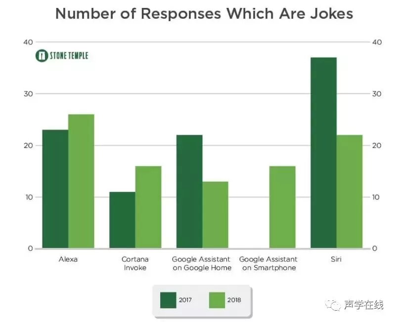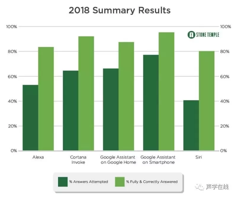 在资讯公司 Stone Temple 对语音助手的严格测试中,尽管没有一个语音智能助理表现得百分百令人满意,但GoogleAssistant 回答问题正确率高达 74.6%,亚马逊的 Alexa 落后一些,也有 44.3% 的正确率。苹果Siri 回答问题的正确率只有 32.7%,并且大量问题 Siri 都无法进行回答。