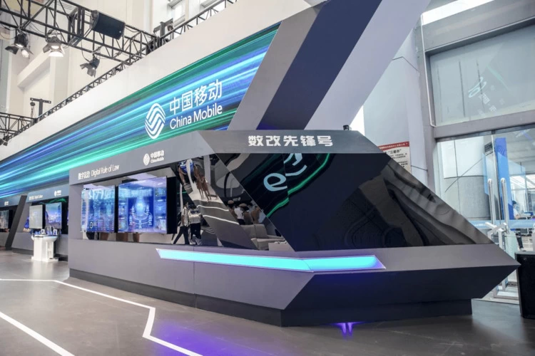 (中国移动展位设计成高铁站风格,信息高铁“数改先锋号”专列正停靠在“宁波站”)