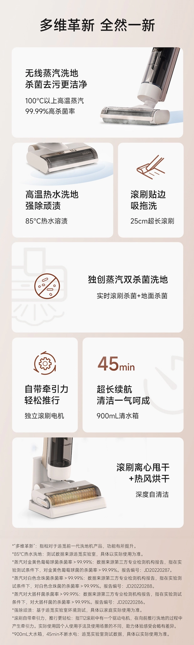 众所周知,地面即便清理干净,也难免有细菌残留,对此,追觅T12洗地机搭载了高温蒸汽杀菌功能,采用无线蒸汽技术,搭配高效率电池、主动电源管理和主动散热技术,通过滚刷前端的4个喷射孔输出30mL/分钟的高温蒸汽,有效清除残留在地面上细菌、微生物、螨虫以及病原体,杀菌率高达99.99%,不仅满足日常宝宝爬行垫定期杀菌的需求,还摆脱了电源线的束缚,全屋自由移动,随取随用,让家居清洁变得更彻底、更高效、更便捷。