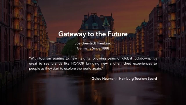 本届IFA,荣耀联合德国汉堡旅游局推出“Gateway to the Future”项目。该项目携手墨西哥艺术家Yunuen与德国艺术家Timo,应用创新的AI、AR技术,在联合国教科文组织认证的世界文化遗产德国汉堡仓库城,通过富有创造性的AR表达,让人们以数字科技的全新方式了解和欣赏文化遗产,带来沉浸式的艺术体验。