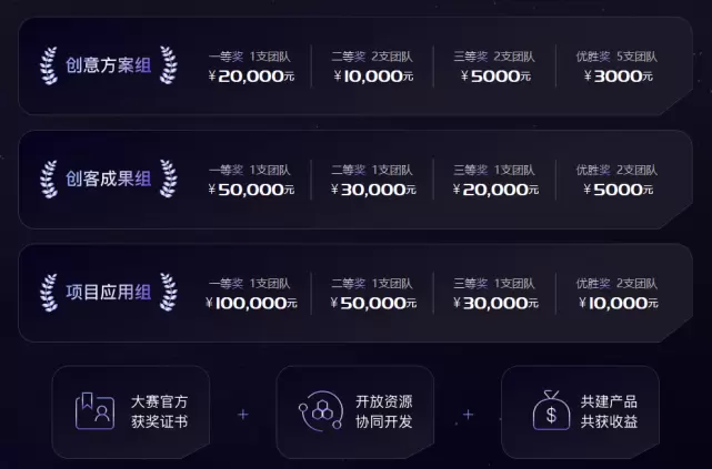 两大赛道中均设置创意方案组、项目/产品组两个组别,分别面向个人、开发者团队或企业征集创意方案、项目及产品,选手可自主选择适合自己的赛道及组别参赛。
