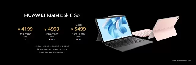 全新华为MateBook E Go,将于2022年9月6日18时8分开启预售,2022年9月21日10时8分正式开售。华为MateBook E Go 8GB+256GB版本售价4199元,华为MateBook E Go 16GB+512GB版本售价4999元,华为MateBook E Go性能版16GB+512GB版本售价5499元(性能版预售与开售时间以官方信息为准)。用户可登陆华为商城及各大授权电商平台或前往华为体验店、华为授权零售门店进行购买。