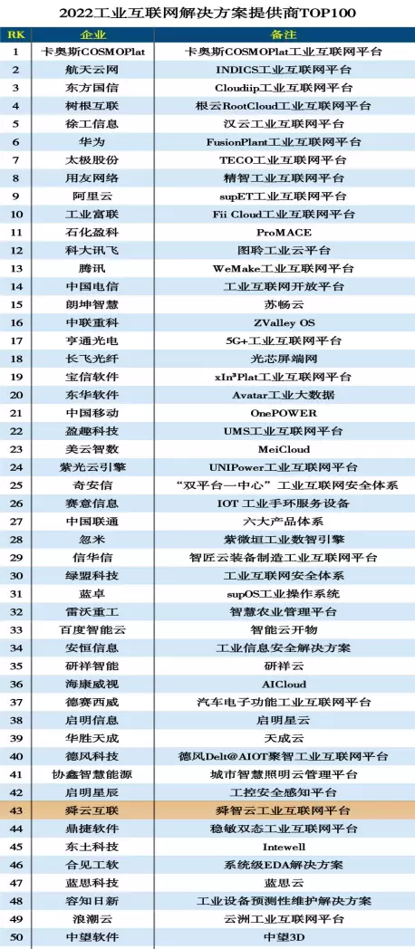 在近日《互联网周刊》联合eNET研究院、德本咨询发布的“2022工业互联网解决方案提供商100强”榜单中,舜云互联凭借在工业互联网领域的成功实践与卡奥斯、工业富联、华为等一众工业互联网企业上榜,并跻身榜单第43位。