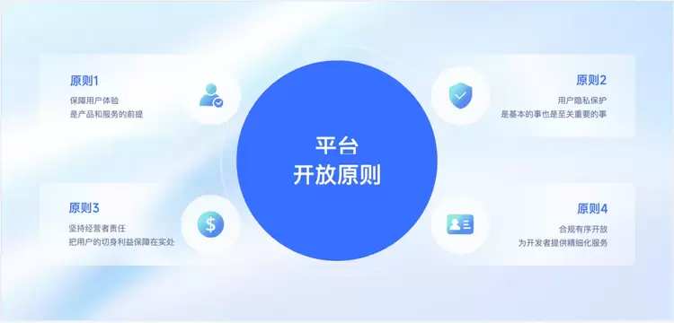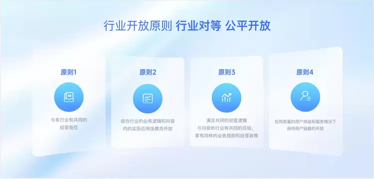 为了保障平台内用户的切身利益,帮助开发者打造健康的竞争环境,抖音开放平台推出了4大平台开放原则规范和行业开放原则规范。