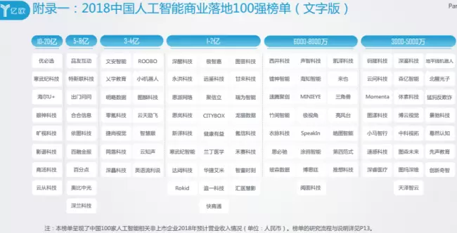 值得注意的是,在AI+企业普遍盈利艰难的同时,仍有部分领域企业取得突破性进展,成绩斐然。于近日公布的《2018中国人工智能商业落地100强榜单》中,商汤科技、旷视科技、影谱科技、寒武纪科技等8强公司,预计2018年营业收入将为10到20亿,高居行业领先地位。
