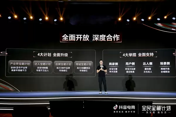 “珠宝潮奢行业六个赛道各有侧重,为消费者带来好内容好商品好服务,让用户在抖音通过观看内容并购买产品,感受到生活中的真好趣,是行业共同努力的目标。”抖音电商珠宝潮奢行业负责人一帆在演讲中提到。为构建全域经营力,牵引珠宝潮奢行业全面发展,抖音电商围绕“产业带、达人、品牌、商城”四个方面升级宝藏计划。未来,抖音电商将扶持1万个产业带商家年销破千万;扶持1000名年销千万达人;助力100个品牌、100款商品年销破亿。同时,抖音电商分别在商家侧、用户侧、达人侧、场景侧铺陈了相关举措,以支撑宝藏计划四个方面的目标。