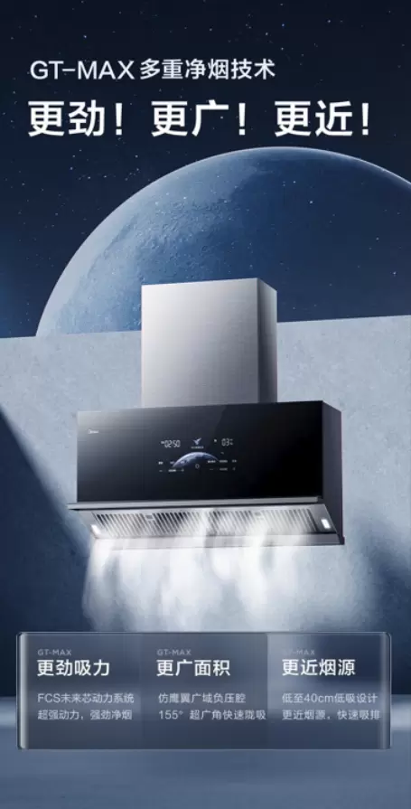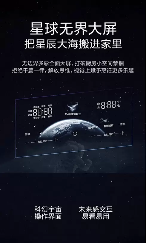 美的无烟感烟机ZA8汲取航天工业灵感,为新品赋予了太空配色、极简外观。采用星球无边界多彩全面大屏设计,太空科技感十足;曜石黑配色,融汇天然琉璃质感,彰显后现代个性之美,带给用户理性厨居美学质感生活。