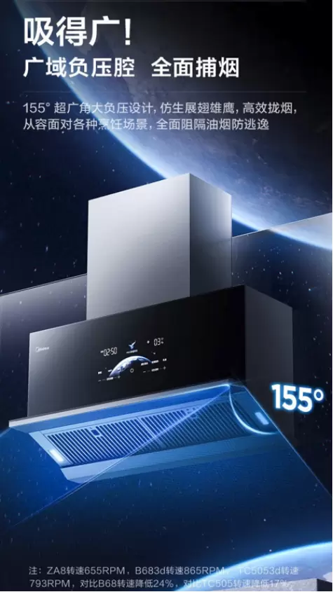 美的无烟感烟机ZA8吸油烟面积更广,采用仿鹰翼广域负压腔设计,带来155°超广角快速陇吸,能全面阻隔油烟,防止油烟逃逸;同时,它更近烟源,创新采用低至40cm低吸设计,更近一步吸净油烟。