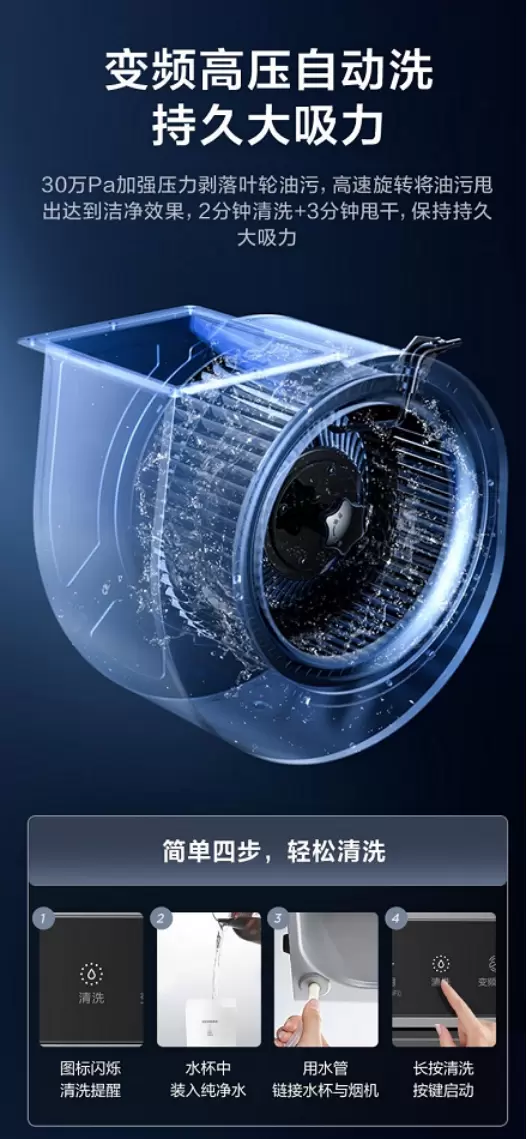 美的无烟感烟机ZA8采用变频高压自动洗技术,能够自动对烟机进行清洁。当清洁提醒图标闪烁时,就需要清洗烟机,用户只需将配套的清洁水杯中倒入纯净水,用水管链接水杯与烟机,长按清洗键,自会有高达30万Pa的加强压力剥落叶轮上的油污,通过高速旋转将油污甩出,让用户无需为烟机清洁而烦恼,更加便捷、省心。
