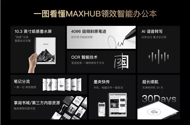 不过,这两年墨水屏的功能也逐渐丰富起来,如华为、掌阅、科大讯飞等各大品牌 主要突出的功能是阅读、语音记录、书写转文字等泛办公功能,但最终还是聚焦于数字阅读。令人惊喜的是,近期入手了MAXHUB领效智能办公本M6 Pro,这是一本既有纸质笔记本的轻薄,也有智能平板的便利,办公高效,适用于各种场合,解决职场白领移动办公的痛点。