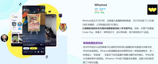 「Whatnot」,是一个以直播拍卖的形式为潮玩收藏者提供二手交易的平台。过往直播电商更多的想去打造爆款,Whatnot 是反其道而行之,将非标产品通过直播、用户和主播之间的类似拍卖形式进行互动,利润空间大,用户粘度高。