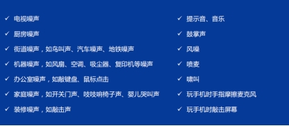 针对元宇宙或者多人音视频交流环境中的不同噪音,通过声网 AI 降噪能力,可以对上百种不同的噪音做精确的消除,由于在端上以 SDK 模式进行,因此不需要有很高的额外成本。支持的噪音消除包括以下噪音: