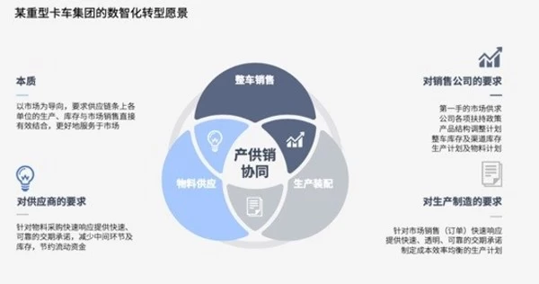 例如,某重型卡车集团亟需开展端到端拉通的"以终端用户体验为核心"的数字化顶层设计,以指导各项业务,尤其是供应链领域的转型机会,并明确企业数字化平台的建设思路。IBM 帮助该企业开展了业务分析与数智化能力诊断,构建了以产供销协同为核心的数智化转型愿景,规划并落地了相应的数字化IT架构。