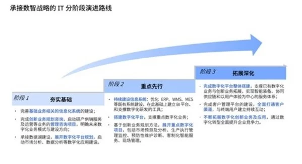 以上三大能力是逐步演进、相辅相成的。技术是基础,平台为载体,最后要贯彻的是企业的数字化、智能化战略。数智战略并非一蹴而就,需要同企业当前的信息化、数字化能力相结合,并制定分阶段的演进目标。第一阶段主要是夯实基础,完善基础业务相关的信息化系统建设和数据基础建设,规划未来的建设方向;第二阶段要重点先行,开展重点的数字化项目,取得速赢,获取关键利益相关人的认可和支持;第三阶段是不断完善拓展,完成数字化平台整体搭建,并拓展数字化创新业务和应用。