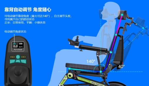它的座躺系统融入了符合人体工程学的电动关节骨架设计,用户仅需要动动手边智能操控盒,便可以轻松调整座椅的角度,确保脊柱、脖颈、头部等身体部位对于特定角度的需求,让用户获得最放松的身体姿势,并可满足坐立、躺卧等多种状态需求,用以实现日常移动、小憩。