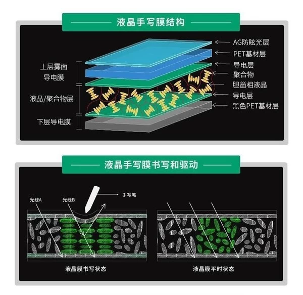 唯酷无尘黑板基于双稳态液晶结构,其原理是,外力按压改变液晶分子的排列结构,使其有序排列,能够反射出自然光,显现绿色笔迹。任意(非尖锐)硬物工具按压都能书写,为开会讨论、日常写画提供了极大的便利。一键擦除时,也仅需要施加微量电流,让液晶分子排列结构复原即可。