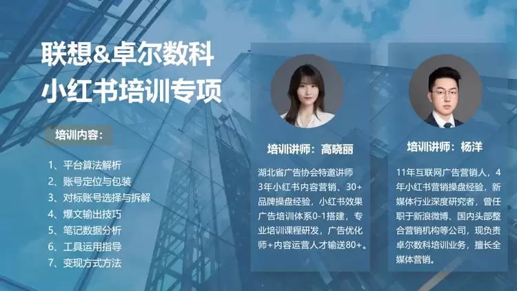 作为全球科技企业领导者,联想业务遍及全球,服务超10亿用户。面对这种市场趋势,联想洞察到小红书、抖音平台的流量优势和其对年轻消费者的吸引力,希望以引入专业服务机构内训的方式赋能员工在小红书和抖音上的运营和营销能力,孵化企业内部的KOC,塑造更好的品牌形象。以此为契机,卓尔数科为联想提供了定制内训课程。针对小红书平台,卓尔数科资深讲师团队三位讲师从小红书平台算法、账号定位、账号包装内容技巧、数据分析、提效工具等多个维度进行授课,培养员工运营账号,并将通过十周左右的测评与考核,让理论内容延展至实践之中,提升联想学员的社交媒体实操能力。