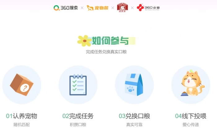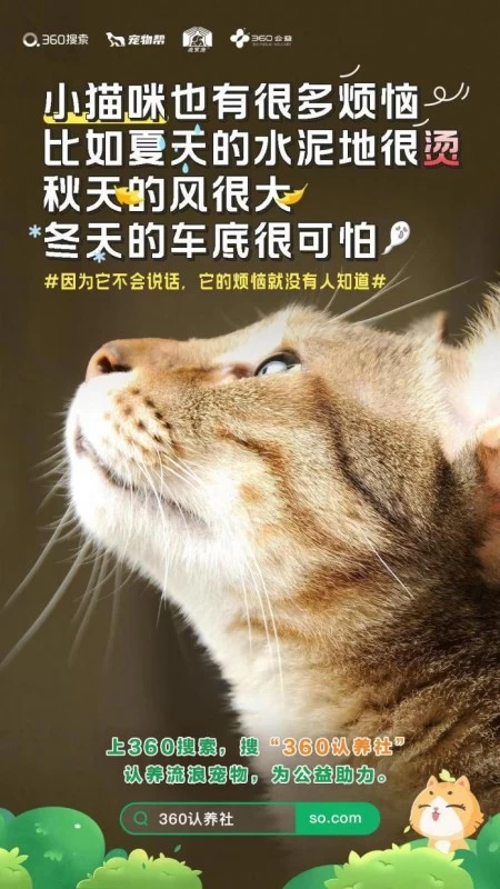 近日,由360搜索、360公益联合推出的爱心宠物认养计划“360认养社”正式启动,通过线上做任务积攒口粮的方式,号召更多网友关心和保护流浪动物。