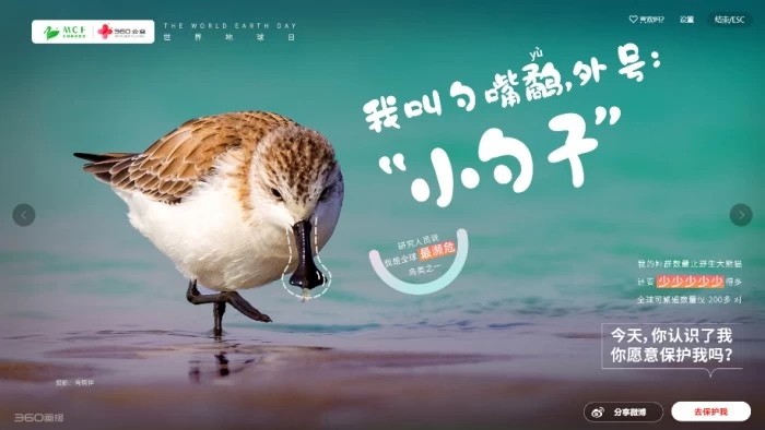 而动物保护也一直是360公益关注的领域。今年世界地球日期间,360公益联合红树林基金会发起“拯救勺嘴鹬”公益科普和筹款活动,利用互联网平台优势,守护生物多样性科普曝光达亿级。
