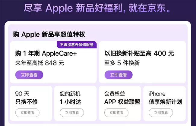 针对iPhone 14系列,京东推出多项超值购机权益,包括以旧换新至高补贴400元、90天只换不修、新机最快1小时达等。特别是针对加购1年期AppleCare+的用户,京东支持下代产品等价抵扣至高848元,让用户以最低价格享受Apple官方的维修服务,188元即可解锁价值3998元的iPhone 14 Pro Max背后玻璃官方维修,新机使用更安心的同时,也让下一代产品换新更省钱,相当于免费使用一年AppleCare+的服务权益,超值又省心。