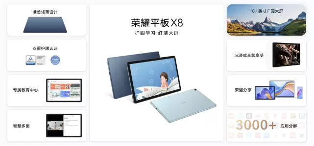 荣耀平板X8是千元档影音娱乐平板优选,拥有10.1英寸全高清屏,以及智慧多窗、应用分屏、教育中心等多项功能,能够极大程度地满足孩子学习和娱乐的双重需求。学海做舟,荣耀平板X8还拥有德国莱茵低蓝光认证与国家眼科工程中心专业护眼认证,能够有效保护孩子的用眼舒适。荣耀平板X8还贴心地上线了家长管控功能,能够有效协助家长平衡孩子娱乐与学习的时间,孩子学得开心,家长买得放心。