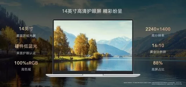 屏幕层面,全新荣耀MagicBook X 14 笔记本 2022采用14英寸IPS雾面屏,16:10的黄金屏幕比例,支持2.2K高分辨率,屏占比高达88%,搭配300nits的高亮度,让色彩更加绚丽丰富;全系通过德国莱茵低蓝光、无频闪双重护眼认证,能够有效降低有害蓝光光源,降低入眼辐射,更专业地保护用户眼部健康。