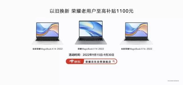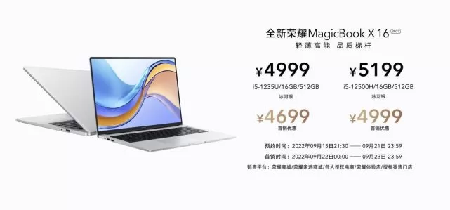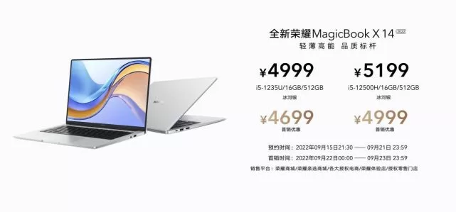 2022年9月15日21:30-9月21日23:59,全新荣耀MagicBook X系列将在荣耀商城、各大授权电商、荣耀体验店、授权零售门店开启预约,9月22日00:00-9月23日23:59开启首销,首销优惠价4699元起。2022年9月15日-9月30日,荣耀京东自营旗舰店正式开启以旧换新活动,荣耀MagicBook X系列、V系列,老用户至高补贴1100元。