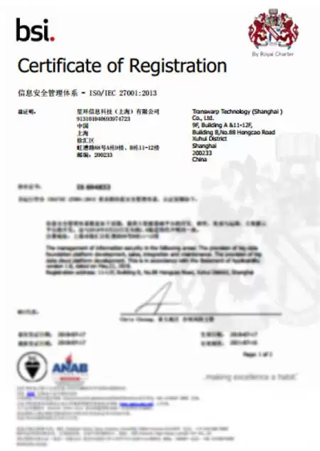 日前,星环科技顺利通过信息安全管理的认证评定,获得ISO/IEC 27001:2013国际信息安全管理体系认证证书。