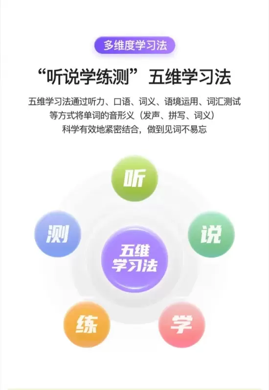 凭借如布科技自主研发AI硬核技术,如布AI双语单词卡K11打造了“听、说、学、练、测”五维学习法。首先从"听"的方面,基于标准的外教发音,单词、例句皆可发音跟随学习;而"说"的方面,通过智能语音评测功能,可以基于学生对于单词、短语甚至是句子的跟读进行打分评测,进而提升口语能力;"学"的方面,基于艾宾浩斯记忆法将单词的记忆和学习阶段进行科学合理地划分;而"练"则是多次背诵仍然记不牢的单词,可以加入到生词本,进行强化巩固练习;而最终"测"的层面,支持单词听写和单词选择测验,可以检测最终对于该单词的掌握程度。通过"听、说、学、练、测"五维学习方法,形成单词学习正向循环,实现学习效果最大化。
