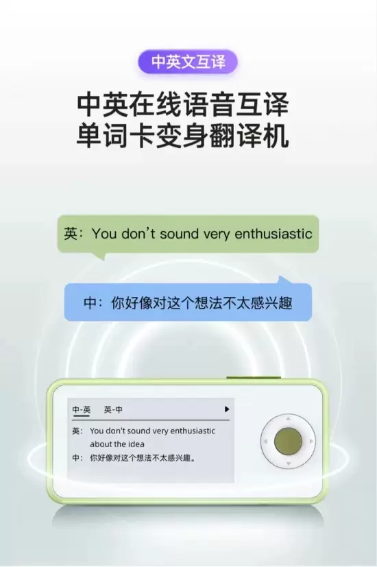 同时,如布AI双语单词卡K11还摇身一变,成为了一台随身翻译机,支持中英文语音互译,方便学生群体语音翻译,方法很简单,只需要长按收音键对单词卡"说话",松开即得到翻译的答案,做到精准且流畅。