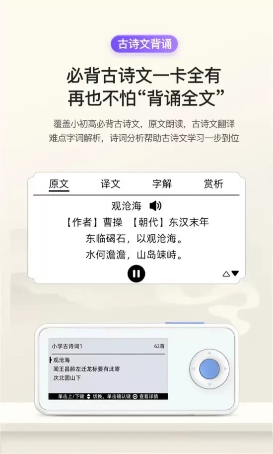 当然,作为一款单词卡产品,如布AI双语单词卡K11本身的功能也得到了升级。除了英文单词学习背诵外,还加入了古诗文学习。K11涵盖了小、初、高必备古诗词,除了古诗文的原文朗读外,K11为了让学生更好的学习也是煞费苦心。比如将难懂的古诗文进行翻译、诗词赏析等功能一应俱全,可以让学生更好的掌握。