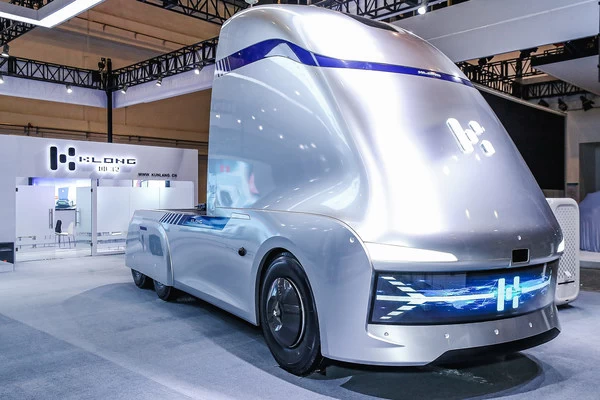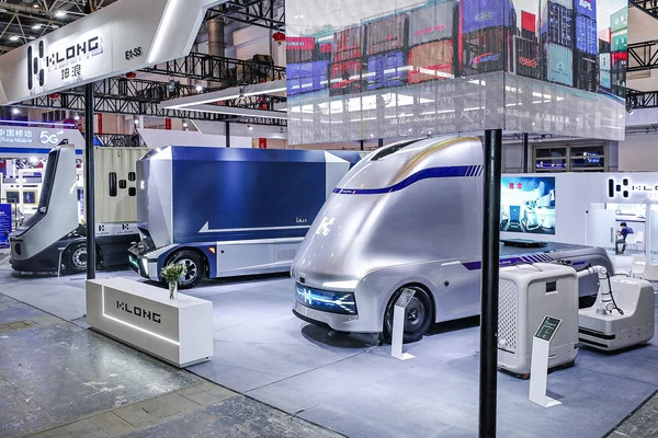 车展完整四个型号无人驾驶商用车展示,其中KL1180EV车型为平台上装的状态