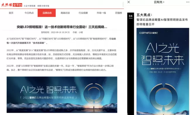 基于金流明公司深厚的技术积累,智谋纪此次预告“AI+LED”的技术创新,也引起了照明行业的热议。这不仅代表智谋纪攻克了照明技术创新瓶颈,更表示其在“AI智慧照明”新赛道完成了关键技术布局。这一重要科技创新成果,也获得了照明行业媒体的广泛关注,大照明全平台、云知光网、照明周刊“智慧Design”等媒体纷纷进行了报道。