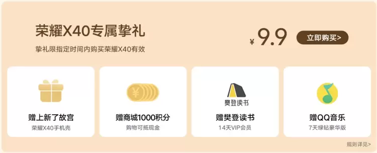 作为荣耀官方自营商城,荣耀商城致力于为消费者带来更高品质的购物及服务体验。在荣耀X系列用户破亿之际,针对荣耀X40新机预订(9月6日-15日),荣耀商城推出荣耀X40专属挚礼,加9.9元即可获赠“上新了故宫”手机壳,此款手机壳选取了象征着盛世富贵的“太平有象”和代表永远年轻、永远活力的“吉祥飞鸟”。祝大家暴富早“亿”点!快乐多“亿”点!。此外更有荣耀商城1000积分购物抵现、14天樊登读书VIP会员、QQ音乐7天绿钻豪华版等多重权益,让用户收到新机即可享受高品质、个性生活。与此同时,荣耀X40系列上市之际恰逢荣耀商城感恩回馈季,荣耀商城联动国民游戏欢乐斗地主,发起荣耀商城杯斗地主挑战赛,9.13-9.22日挑战赛期间,携手为挑战者送上手机、蓝牙耳机、手环和海量欢乐豆等丰富奖品。