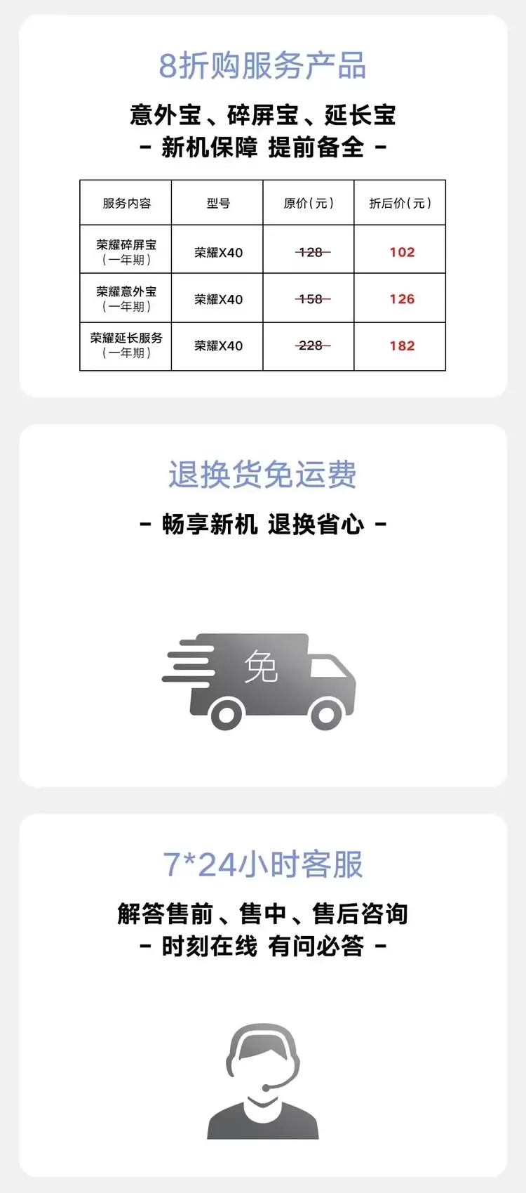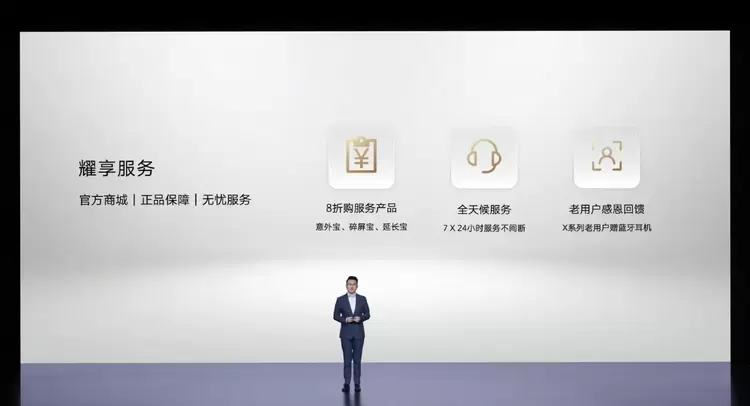 新机正式发布后,荣耀商城福利、服务再次加码。本次发布会上,荣耀商城推出“耀享服务”,其覆盖售前、售中、售后等一系列服务,一站式提升消费者购机及使用体验。本次荣耀X40新品首发9月15日至23日期间,荣耀商城X系列老用户在荣耀商城购买新款荣耀X40,可获赠荣耀亲选 Earbuds X2蓝牙耳机,入手即可享受新潮电子生活。同时,为让消费者放心享受10亿色OLED曲面屏等卖点带来的旗舰体验,新老用户购买荣耀X40均可享受购意外宝、碎屏宝、延长宝8折购买权益,为新机提前备全保障,在荣耀品质的加持下,新机到手使用无忧。荣耀X40上市期间,荣耀商城客服还将提供7*24小时不间断的全天候服务,解答售前、售中、售后等各类咨询,辅助消费者决策排忧解难,为其带来全流程服务陪伴。